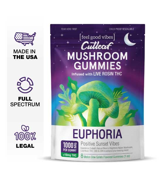 Cutleaf crafts its Mushroom Gummies Euphoria with Live Rosin Hemp-Derived THC using the purest form of CBD hemp extract on the market. This rosin extract undergoes a cold-press process, pressing USDA organic hemp flowers to extract the plant’s cannabinoids, oils, and terpenes without chemicals or solvents. The result is an extract from the entire plant that is rich in CBDA and THCA, both of which offer amazing benefits you won’t find in other hemp products. Try our daytime product for everyday use and our nighttime product for your best sleep! Each gummy contains 1000mg mushroom, 20mg CBD Live Rosin,5mg CBN, & 10 mg hemp derived THC.